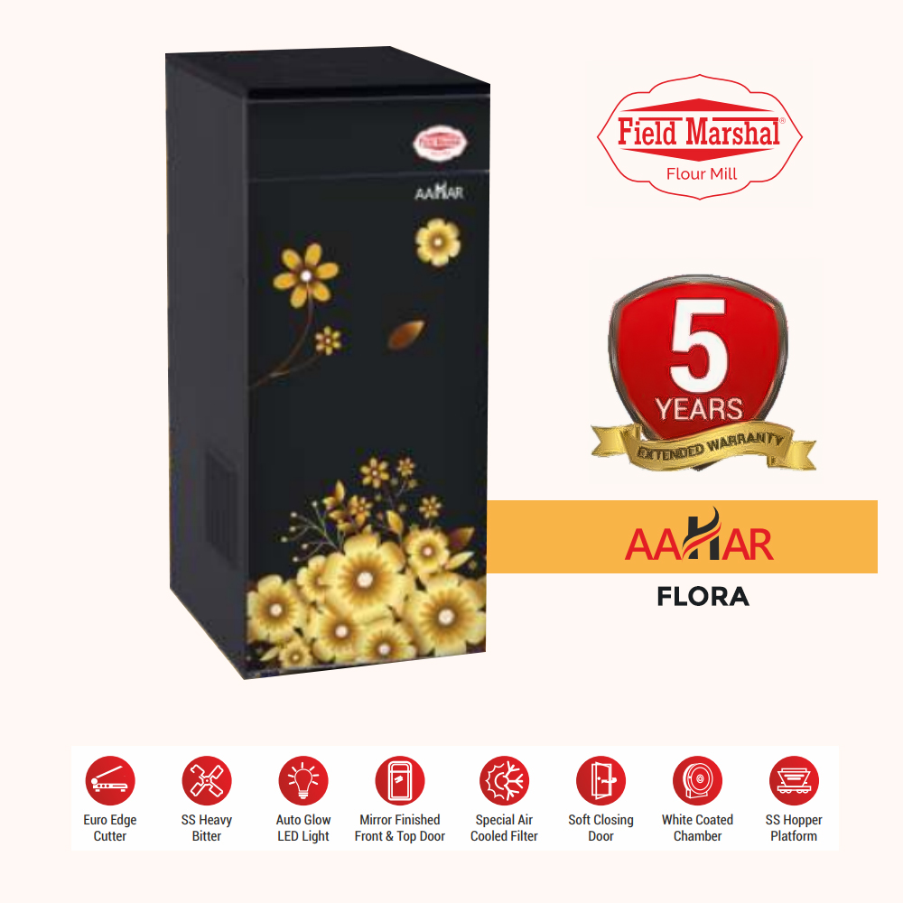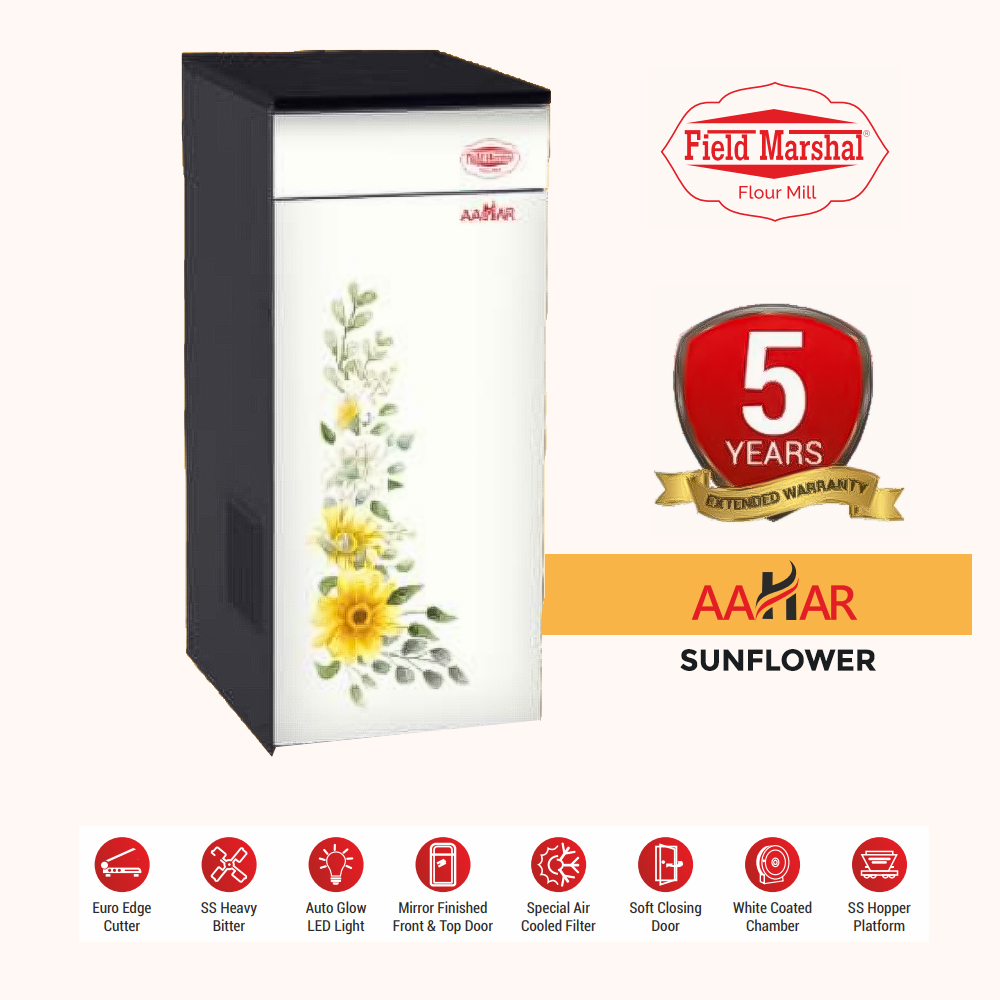 Fieldmarshal Flour Mill as the name suggests is an Electrical appliance used in grinding Flour, Masala from the grains like Wheat, Corn, Bajra, Rice, Spices etc. Keeping in view of Hygiene, Safety, Purity and Food Grade quality material has been used for the desired output at very economical, competitive price range. It is completely user and Eco Friendly Appliance as whole operation is Fully Automatic and Dust Free.