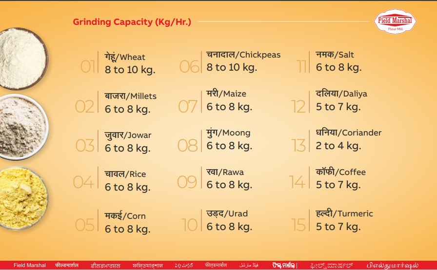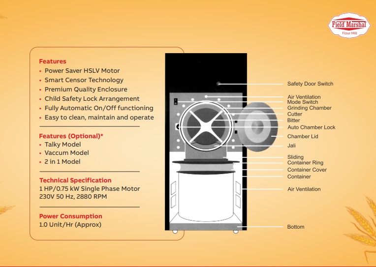 Fieldmarshal Flour Mill as the name suggests is an Electrical appliance used in grinding Flour, Masala from the grains like Wheat, Corn, Bajra, Rice, Spices etc. Keeping in view of Hygiene, Safety, Purity and Food Grade quality material has been used for the desired output at very economical, competitive price range. It is completely user and Eco Friendly Appliance as whole operation is Fully Automatic and Dust Free.