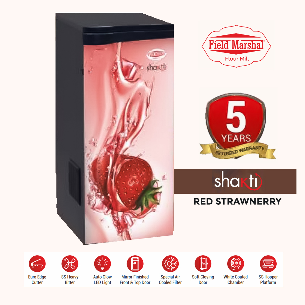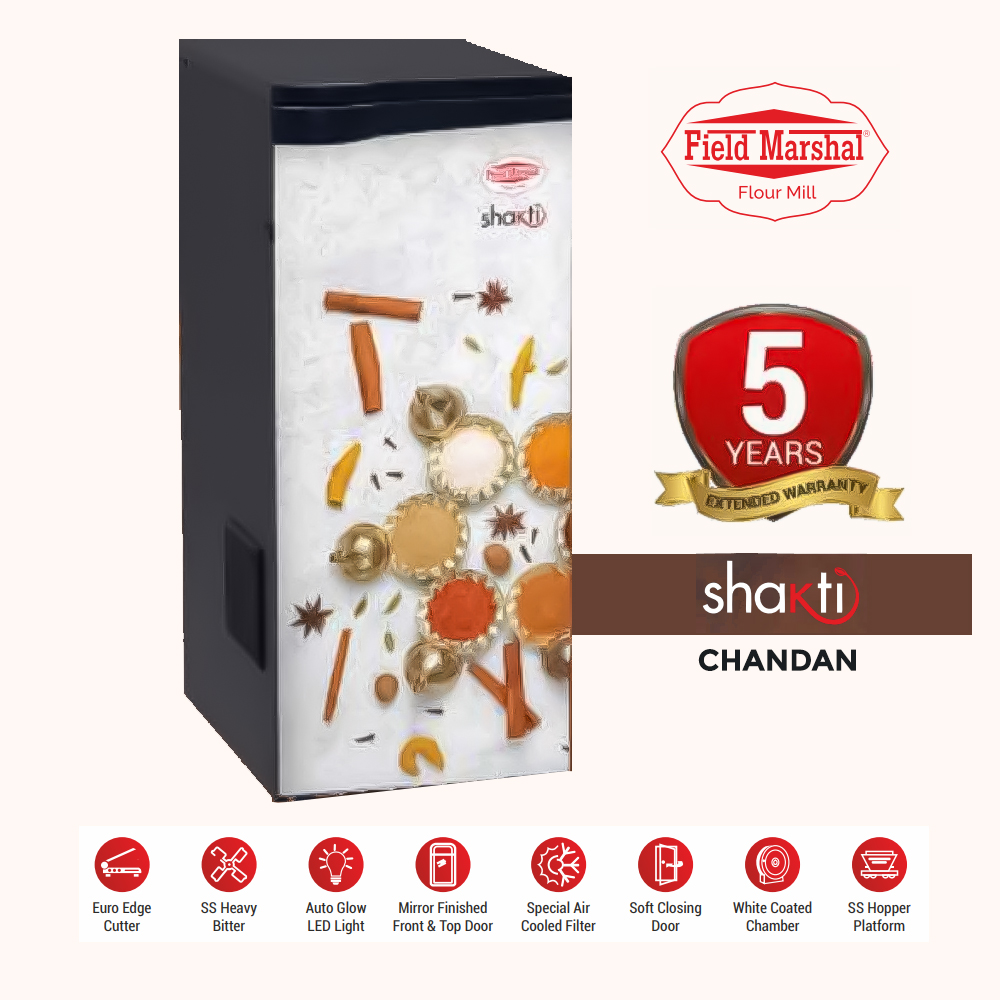 The power packed flour mill SHAKTI is especially designed for grinding Masala alongwith Grains, Cereals etc. It has mirror finished top and front door with superior quality MDF enclosure having attractive designs. It has amazing looks and a unique soft closing door system. It is equipped with highly précised Food Grade EuroEdge Cutter, S.S.Bitter, Hopper, Container and specially designed AirCooled Filter for better cooling of the flour.